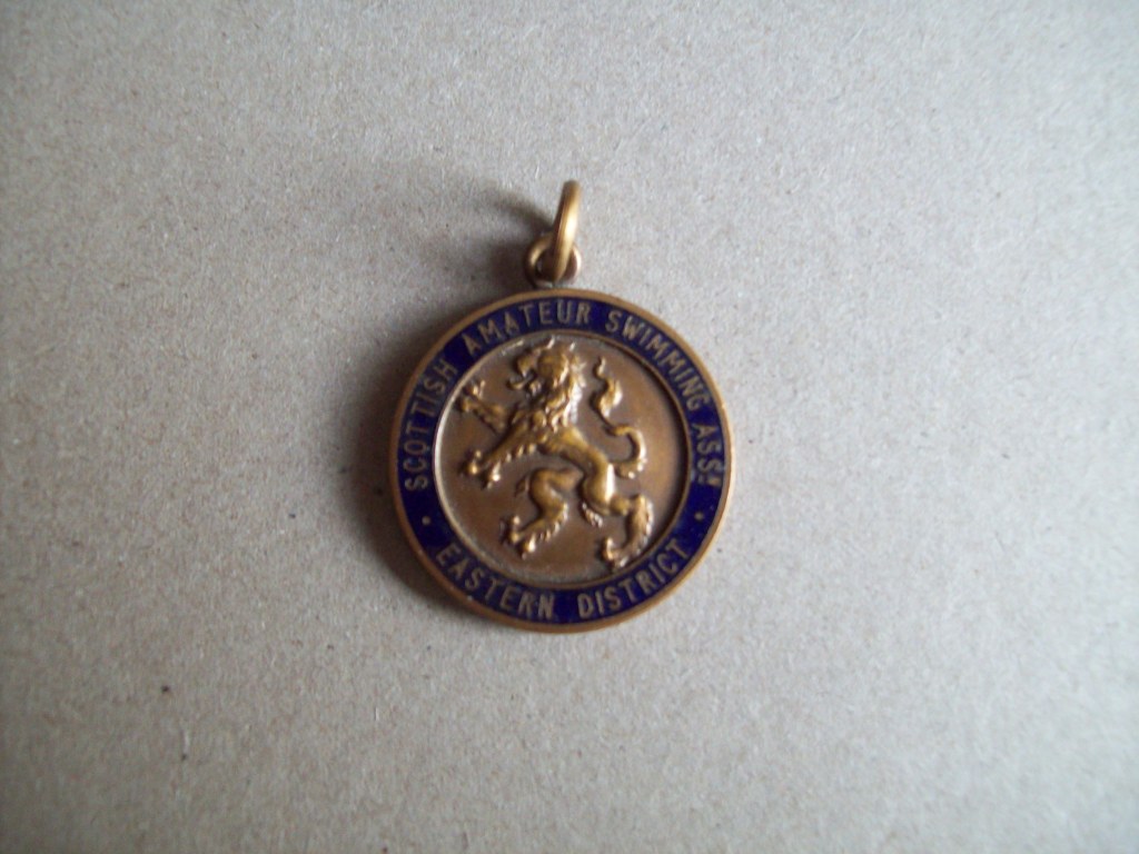 I still have my medal. The obverse shows a lion rampant with these words: Scottish Amateur Swimming Assn. Eastern District. The reverse is inscribed: Mens Swimming League Junior 1956.