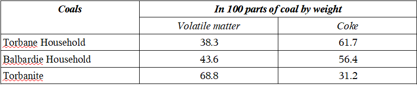 One ton of torbanite gives 15 480 cubic feet of gas. No other coal produces as much. The next best gas coal is Capeldrae from Fife. It produces 11 500 cubic feet of gas per ton. Torbanite is also the most valuable coal. For example, it is nearly twice as valuable as Capeldrae gas coal and nine times more valuable than Leven (Fife) splint coal.